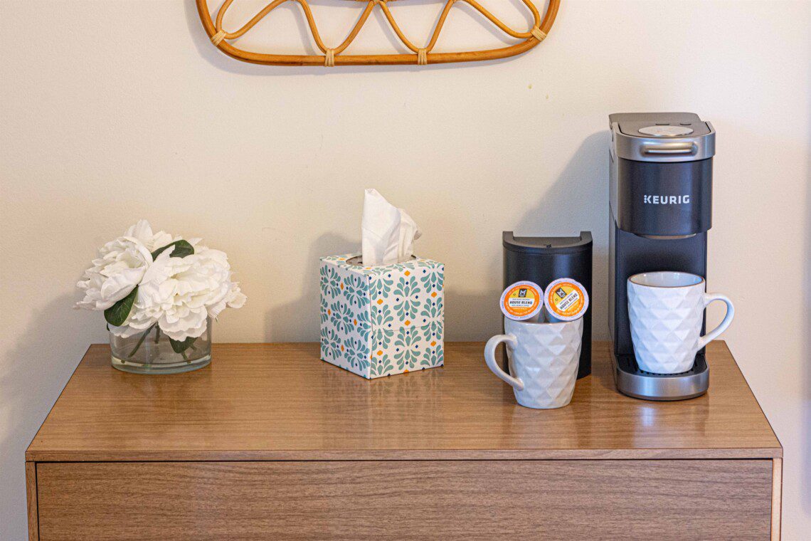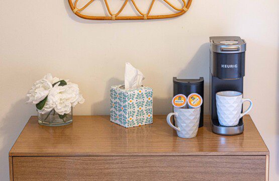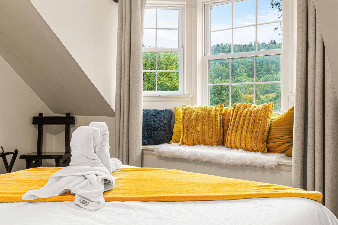 – Bedroom 1: Queen bed, coffee bar & cozy window seating overlooking the valley