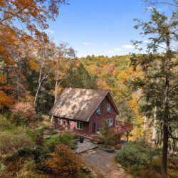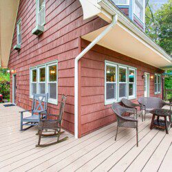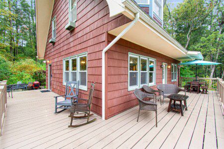 The wrap-around deck with seating offers expansive views over the creek bottom, a portion of the Delaware State Forest, and the Pinchot Experimental Forest.