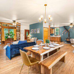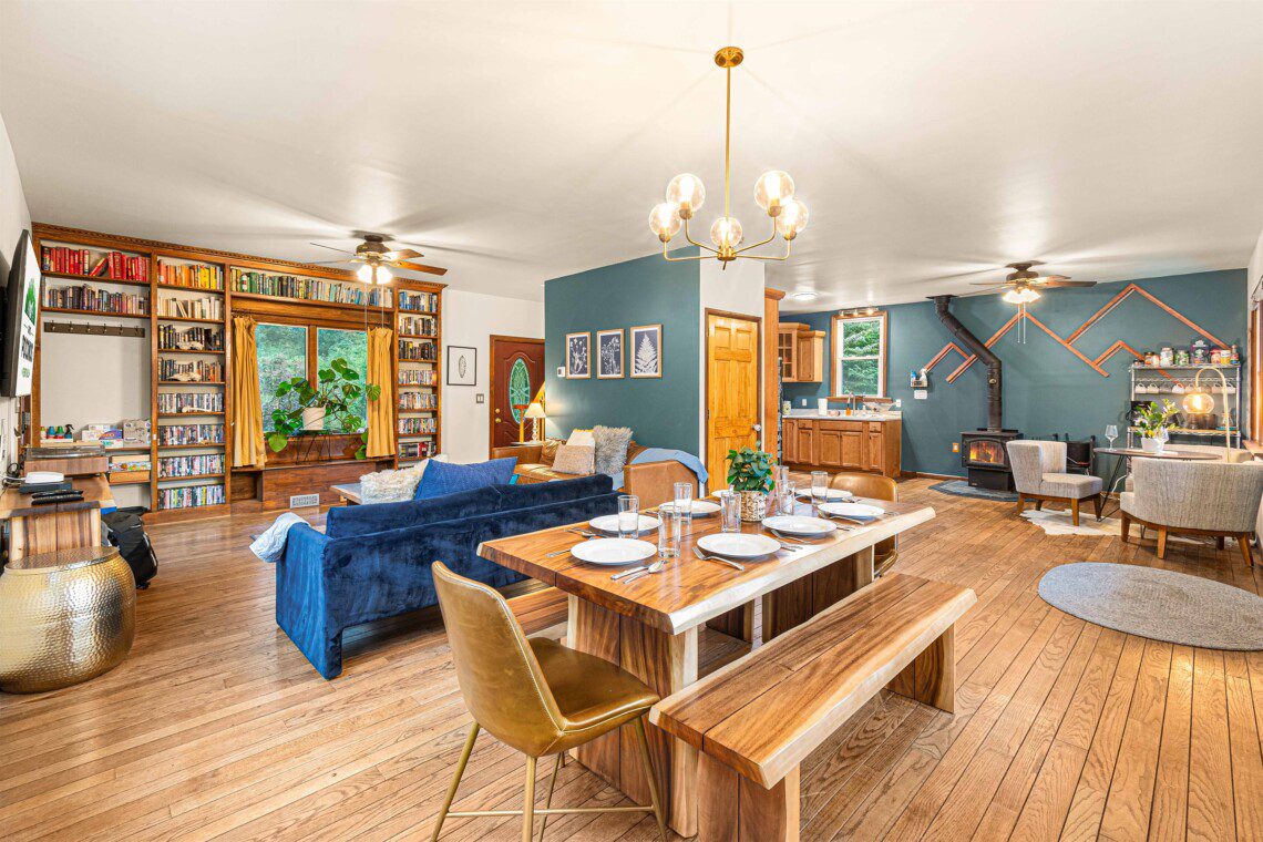 Everyone can gather in the open main level which includes a family room, kitchen, dining room, and a half bathroom. Built-in bookshelves provide an eclectic library of books and DVDs. Large windows make this space bright and full of natural light.