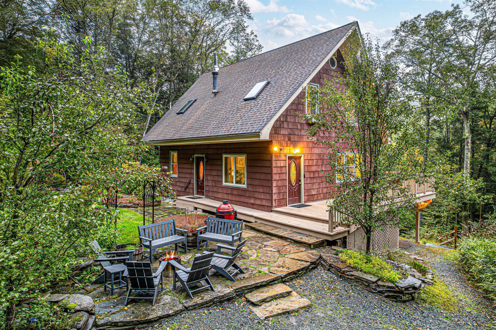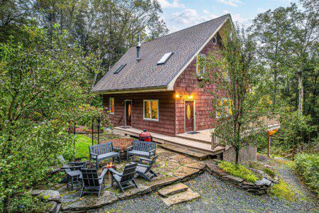 Sawkill Creek Cottage is set amidst a private backyard with fruit trees, three babbling springs, and a thousand springtime daffodils. The front yard slopes to the confluence of the Savantine and Sawkill Creeks, two "exceptional high value" streams flowing out of Delaware State Forest.