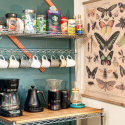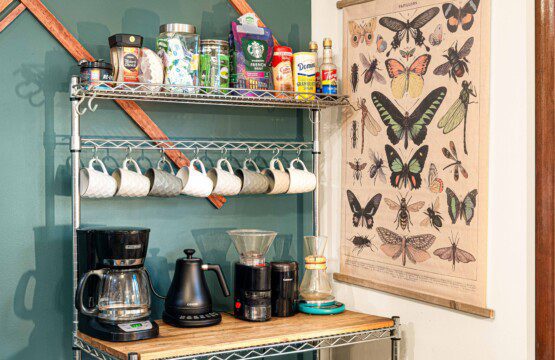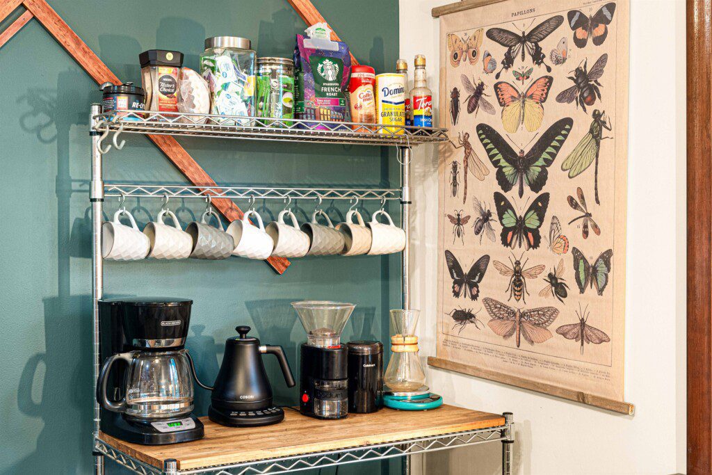 * Fully equipped kitchen with coffee bar: percolator, French press, burr grinder, scale, Chemex pour-over carafe, and electric gooseneck kettle